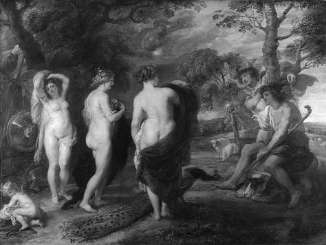 The more I look at it, the more I see that the myth is not only about which bribe is stronger, but about which kind of wanting is bearable. Given that tense situation of three divine forces in front of him, it is very easy to choose satisfaction and comfort. It frames the choice as a risk calculation that happens inside a trembling body. The word "fairest" is really a trap-word, which locks a whole future into place. When Paris chooses Aphrodite, I imagine her being unceremonious, that apple was never the prize to her. She had to win the contest that claims the winner to be the most beautiful. What remains of a goddess of desire when she is publicly told she is not the most desirable?