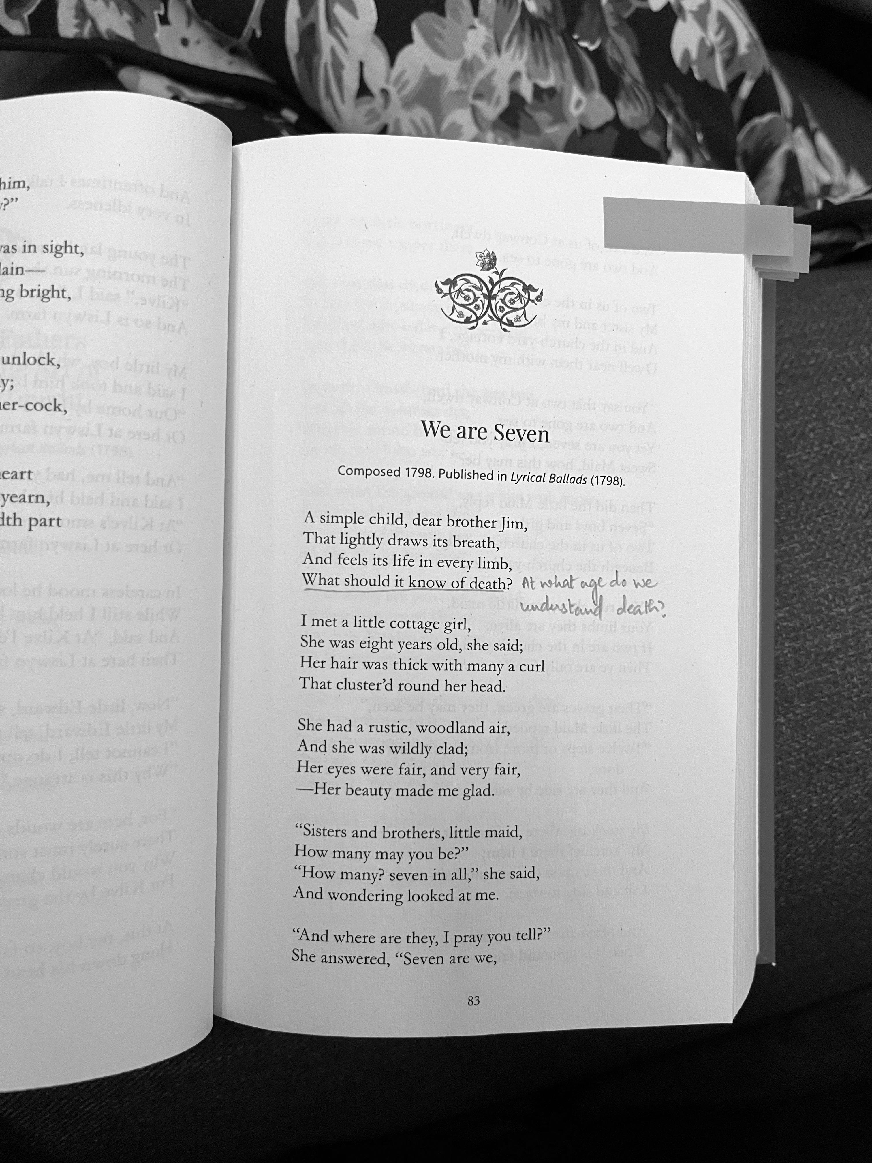 At what age do we understand death? I found myself asking this after reading William Wordsworth’s We Are Seven. I have just read it and could not help but write to you about this beautiful poem.