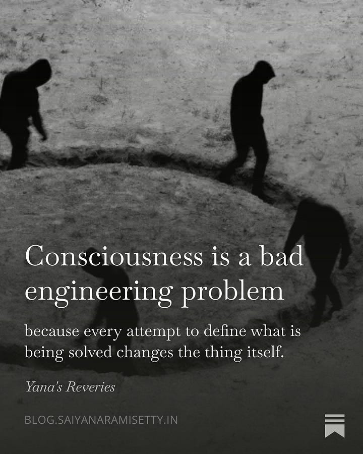I try to understand consciousness the way I understand engineering problems. But in engineering, you must clearly define the problem before you can solve it. Consciousness doesn’t stay still long enough for that. The mind is both the tool we use to study consciousness and the thing we’re studying. Unfortunately we can’t step outside it to look at it objectively.